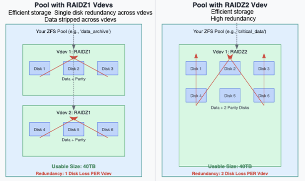 La redundancia siempre es por vdev. Si alguno falla, todo el pool falla, incluso si otros vdevs están saludables. ¡Planifica tus vdevs con cuidado!